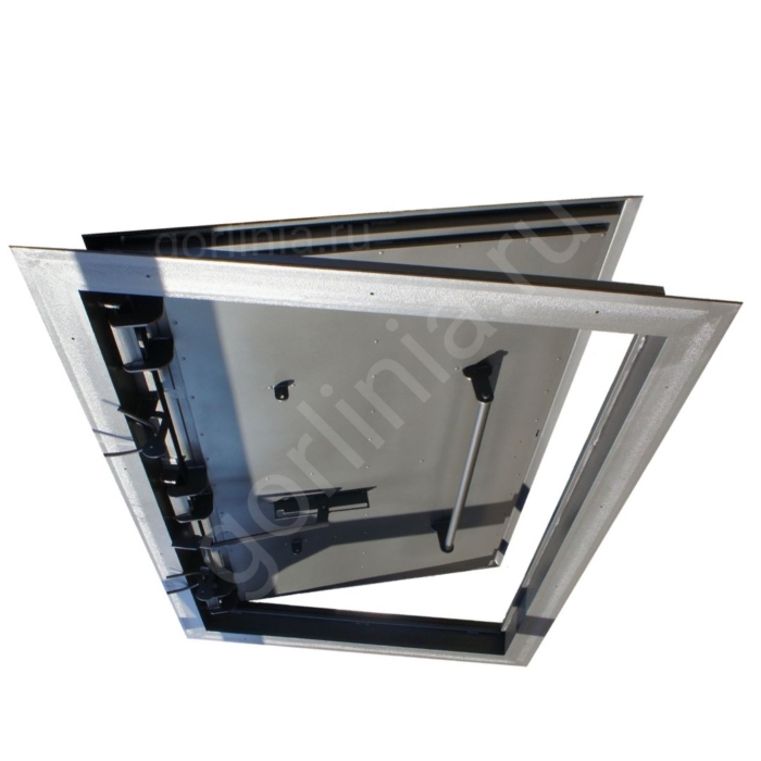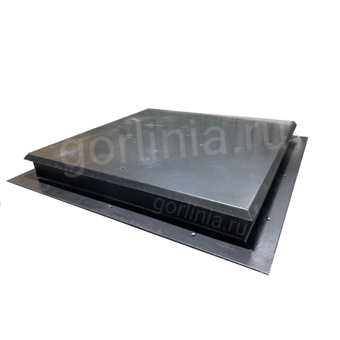 Откидная крышка закрыта сверху гладким стальным листом с загнутыми краями с нахлестом 30 мм на коробку. Внутрь каркаса двери между профилями обвязки проложена минеральная вата 50 мм, слой утепления подшит снизу листом 1 мм.