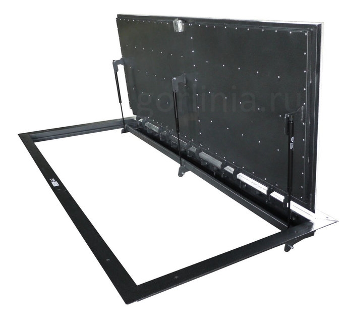 Створка в сэндвиче из листовой стали обшита плитой ГВЛВ в уровень с полкой наличника рамы, все элементы фурнитуры (замок, газлифты, шарниры) скрыты внутри: верхняя лицевая часть подготовлена под финишной отделку плиткой/ламинатом с отступами и зазорами по схеме завода-изготовителя.